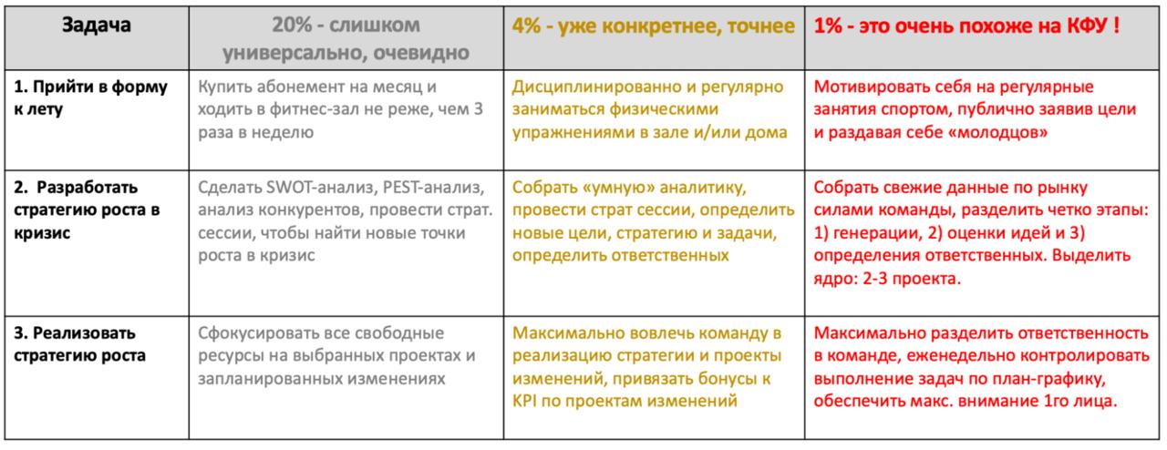 Вот примеры – от более универсальных (20% – первый отжим в правиле Парето) до узкофокусных (третий отжим – тот самый 1%, дающий 50% результата). Правая колонка – это примеры хорошо сформулированных КФУ.