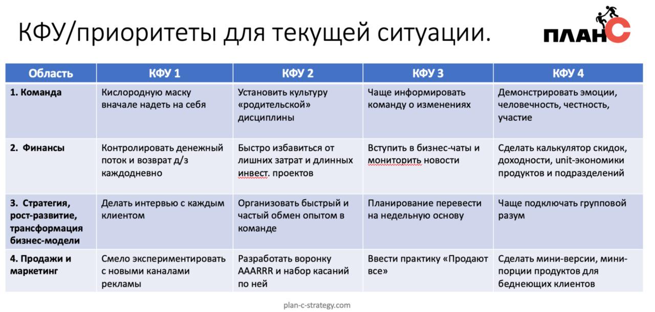 Ниже приведены несколько КФУ для текущего времени в ряде важных для бизнеса областей. Мы выделили их на рабочих сессиях с клиентами нашей программы «План-С». Присмотритесь, что из этого списка стоит взять вам для минимизации последствий кризиса.