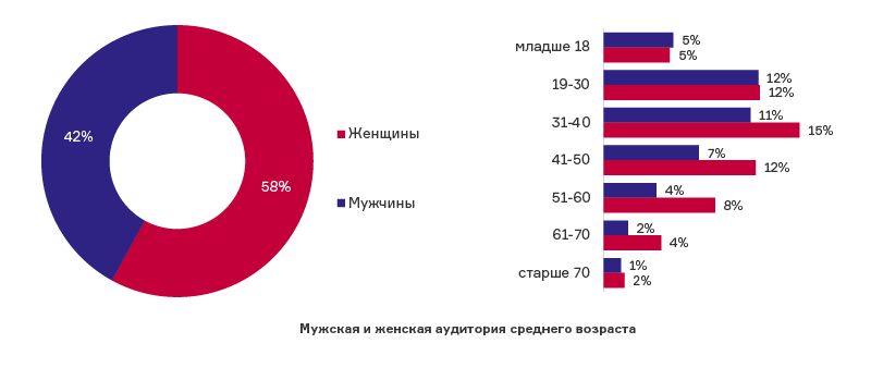 Если смотреть на демографию белорусских посетителей, то наблюдается преобладание женской аудитории над мужской: 58% против 42%. Основное ядро – пользователи в возрасте от 19 до 50 лет. Также в возрастной категории 31–40 лет доля женщин значительно превышает мужскую аудиторию.