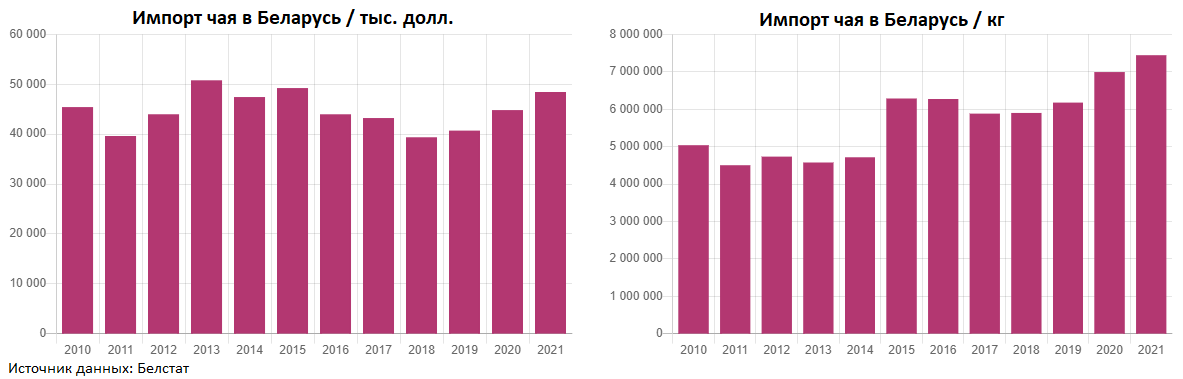По данным официальной статистики, в 2021 году Республика Беларусь импортировала 7438 тонн чая на сумму $48,4 млн.