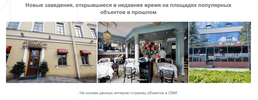 Иногда это может происходить без смены собственника (арендатора), а по факту изменения формата и концепции самим оператором. Довольно часто заведения открываются на месте своего рода «легендарных», привычных, принимавших гостей многие годы. Так, начали функционировать Astoria Central на месте ресторана «Ренессанс»; бистро Martinique Brasserie на площадях Bistro de luxe; ресторан китайской кухни «Личи» на месте кафе «Гурман» и др.
