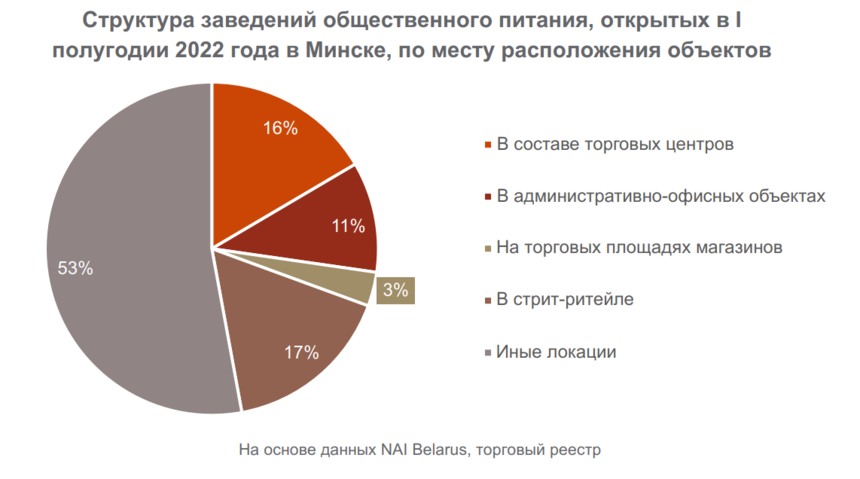 Схожая структура открытий была характерна и для I полугодия 2022 года. Лишь несколько выросла доля кофеен. Это может быть как погрешность названия типа заведения при внесении в торговый реестр, так и может соответствовать действительности: в Минске в период с 2017 года начался бурный рост кофеен. Этому способствовало несколько факторов: