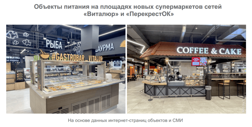 Уловив волну популярности питания в общественных заведениях, торговые сети начали формировать фуд-зоны внутри торговых залов. Это отчетливо наблюдается последние года три. В зависимости от площади магазинов это могут быть совершенно разные по размеру и уровню предложения объекты: от небольшого салат-бара с кофепоинтом до вполне масштабного фуд-корта с многообразием предложения или даже кафе самообслуживания с посадочными местами.