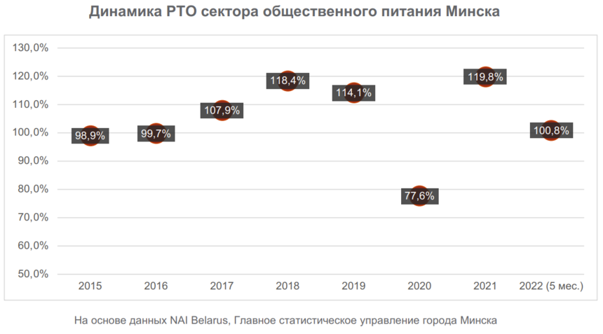 Ставки арендной платы на помещения для сферы питания сохранились довольно стабильными. Во-первых, в первые месяцы 2022 года не было предпосылок для падения: еще с 2021 года снимались ковидные ограничения, народ и компании отпраздновали рождественско-новогодние корпоративы – самое «сытое» время для общепита. И темп роста РТО минского общепита в 2021 году, +16,6% – все это сформировало хорошие предпосылки для развития сегмента на начало 2022 года. После январской паузы рынок стал входить в обычное русло.