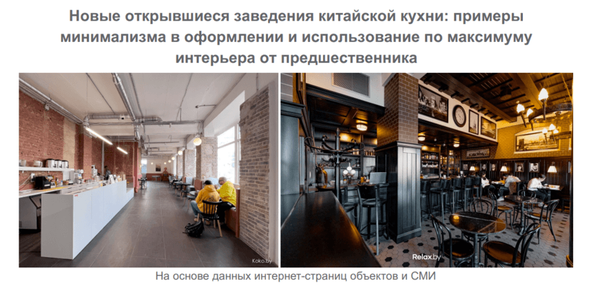 • Ярко выраженный «восточный вектор». После периода пика роста популярности суши-баров, на рынке Минска наблюдался уклон на европейскую кухню. Сейчас в тренде открытие объектов восточной кухни: китайской и турецкой, индийской и др. Специфика текущего периода – объекты открываются именно представителями данных этнических групп. Представители стран «восточного вектора» присутствуют и среди покупателей недвижимости под общественное питание в собственность. Собственникам недвижимости, подыскивающим арендаторов, стоит обратить внимание на этих партнеров. Например, китайские объекты открывались в текущем году в самых неожиданных местах: от тихой улочки Дорошевича до самого что ни на есть исторического центра: ул. Городской Вал и пр-т Победителей,1. Они занимали помещения некогда пафосных заведений, не выдержавших испытаний измененной конъюнктурой. И наоборот, можно найти примеры локаций очень скромных объектов недвижимости.