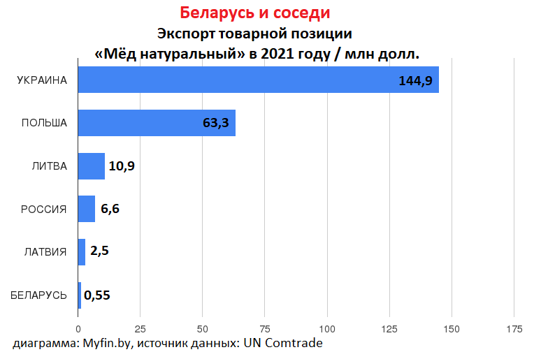 Если говорить о поставках Беларуси и ее соседей, то в 2021 году РБ по объему экспорта натурального мёда уступила всем соседним странам.