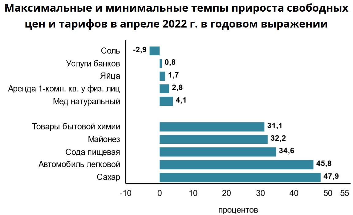 Приведены данные о максимальных и минимальных темпах прироста свободных цен и тарифов по итогам апреля в годовом исчислении.