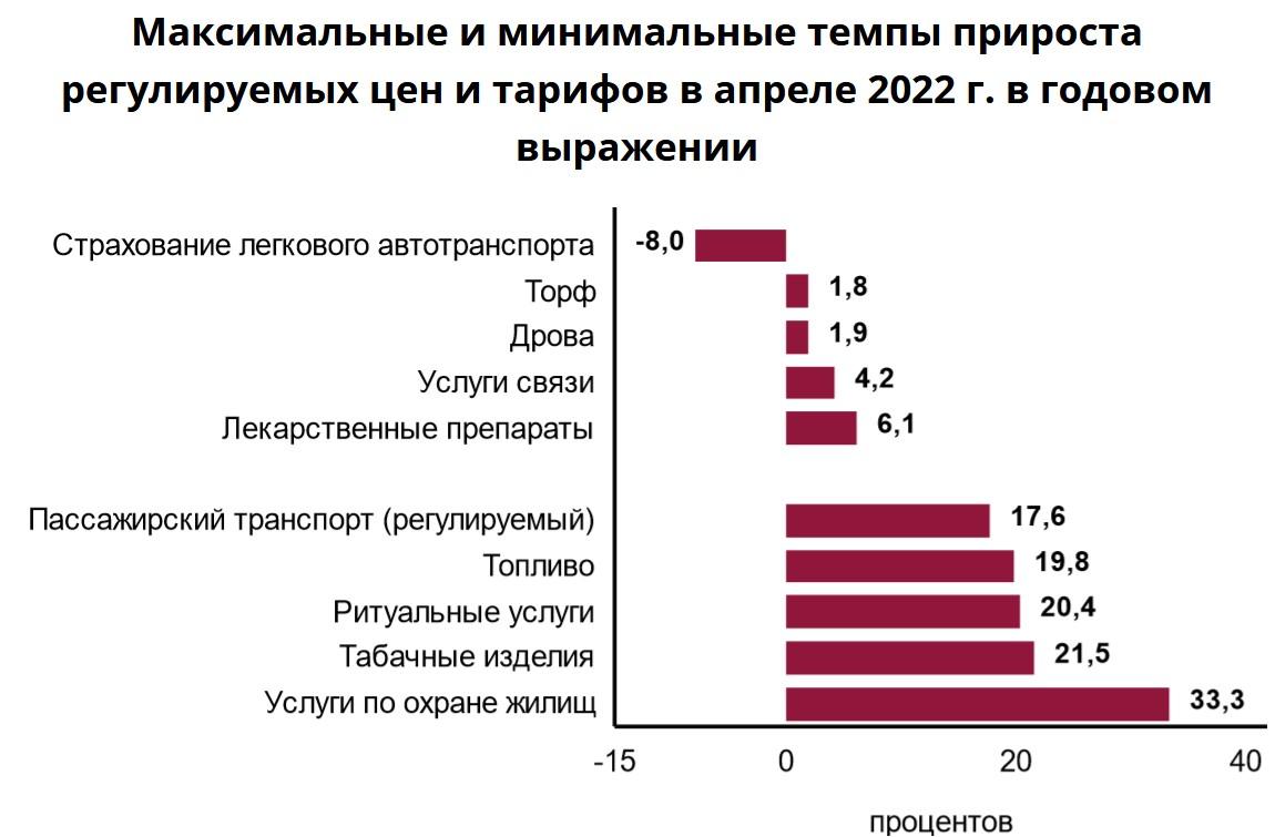Что касается прироста регулируемых цен и тарифов в апреле, то максимальные и минимальные темпы в годовом выражении находились в диапазоне от минус 8% по страхованию легкового автотранспорта до плюс 33,3% по услугам охраны жилищ.