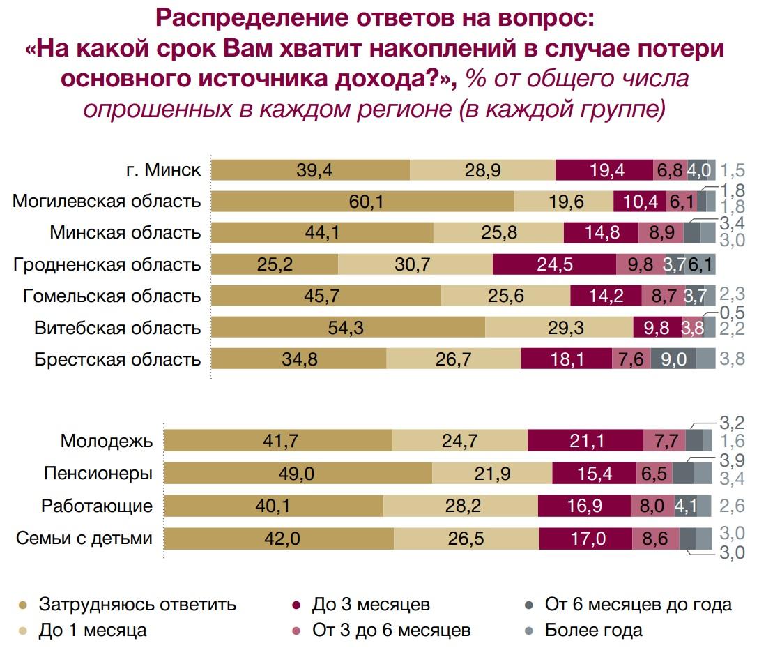 Помимо прочего, респондентам задавали вопрос о том, на сколько хватит их сбережений, если они потеряют основной источник дохода. Оказалось, что дольше всего продержаться на накоплениях смогут жители Брестской области: 3,8% – больше года, а 12,8% – от полугода до года. А вот в Минске самые низкие показатели по стране: больше года жить на сбережения смогут всего 1,5% населения столицы, а от полугода до года – 4%.