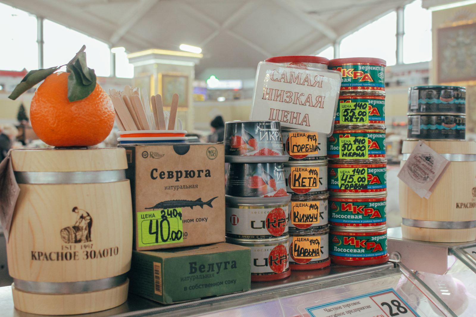 Небольшое оживление возле павильона с морепродуктами. Практически все прицениваются к икре. Купить можно и не за космическую сумму, выбрав приемлемый для себя вариант на развес. Есть коробочка на подарок: красивый набор из четырех баночек с разными видами икры за 159,99 руб. Любопытно, что именно на рыбных витринах сидит большое количество золотых лягушек. Продавцы говорят, что фигурки жабок с монетками – к прибыли. А вот в битве палтусов из Гренландии и Мурманска с преимуществом в 50 рублей побеждает последний. Ведь на вкус рыбы одинаковы.
