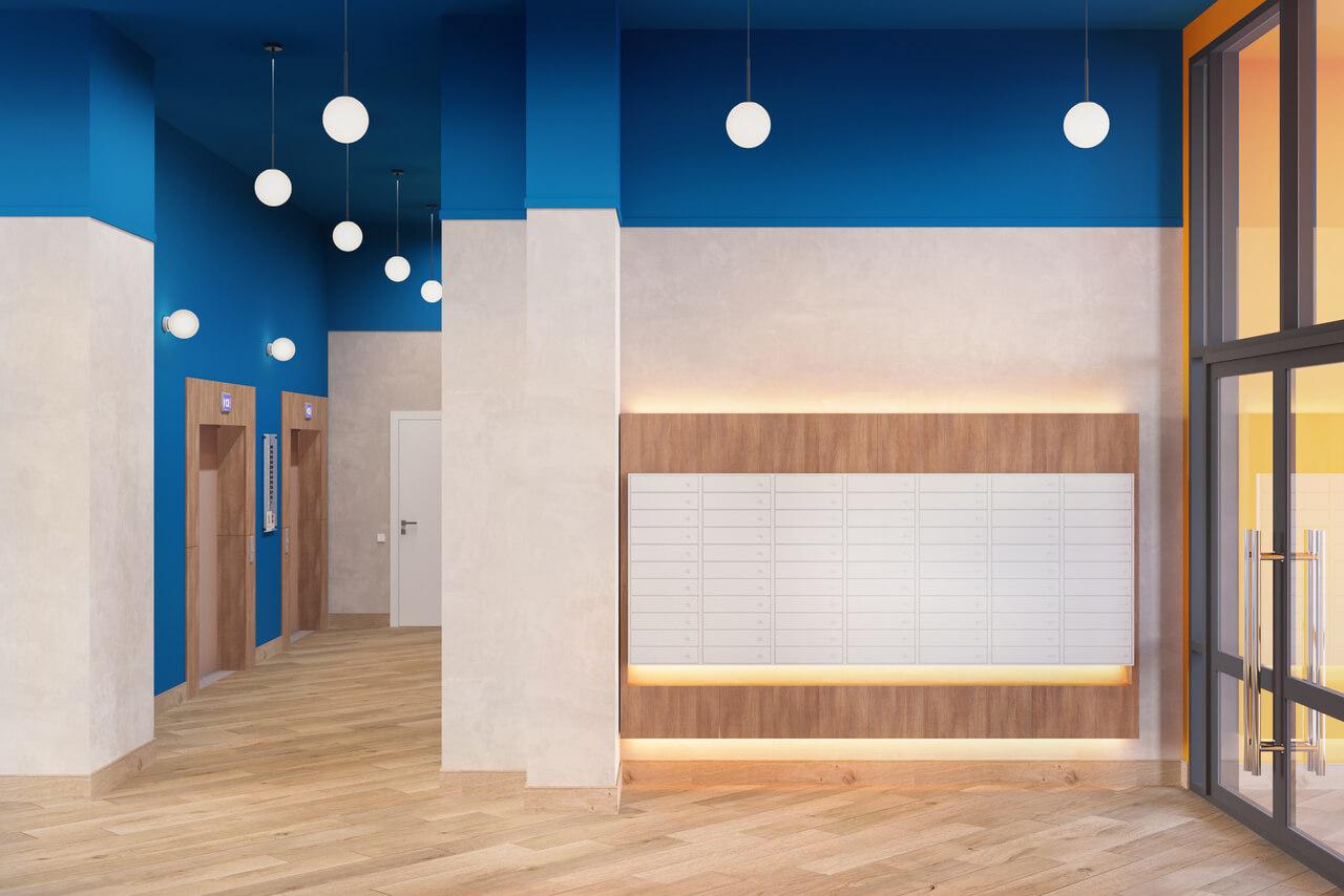 Стильное и просторное лобби со стойкой для консьержа, территорией отдыха, санитарной комнатой и байк-боксом.