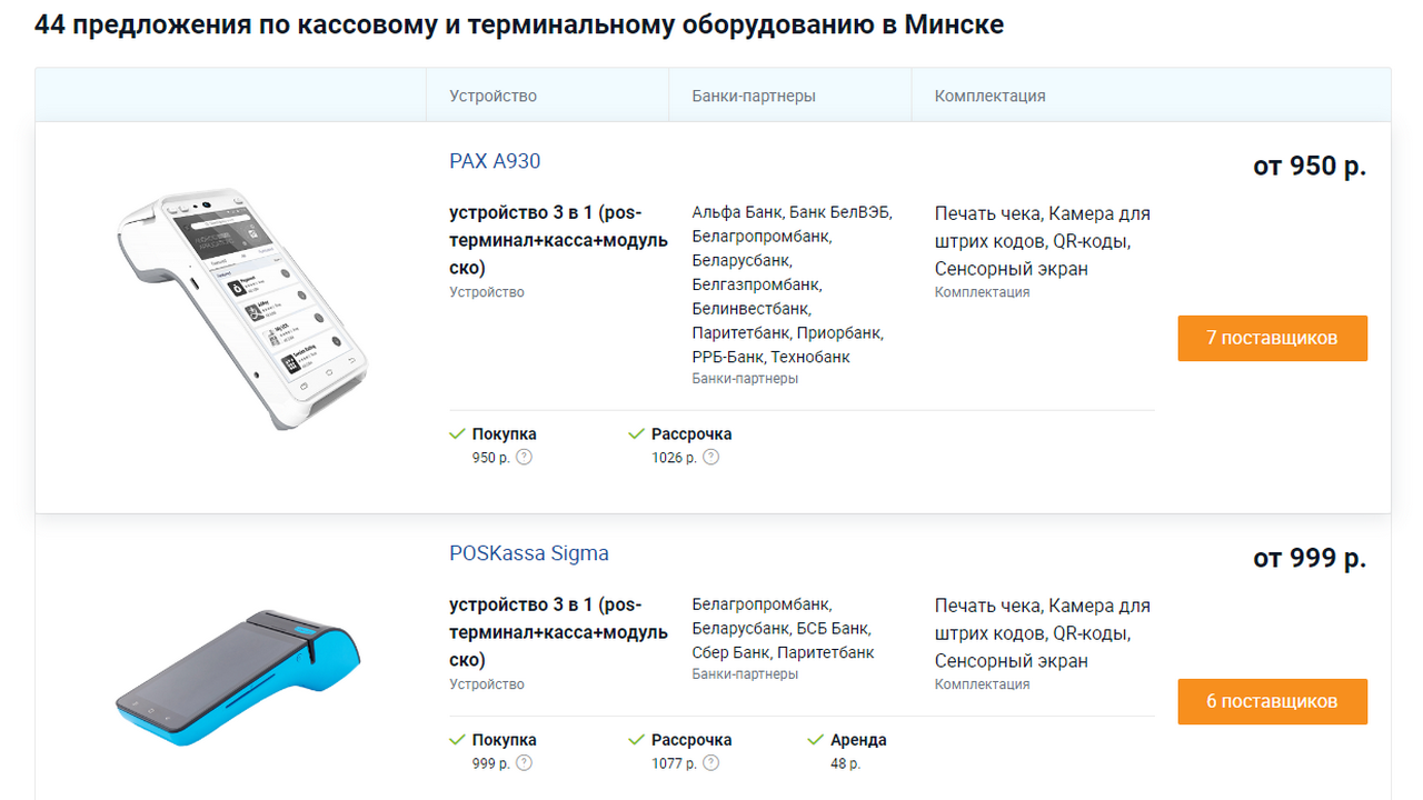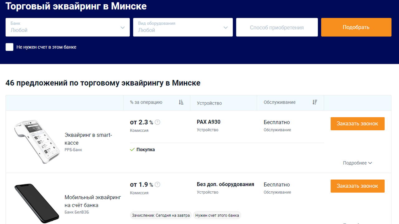 На портале Myfin.by есть удобный сервис по подбору торгового эквайринга. Всю необходимую информацию (включая тарифы от белорусских банков) вы найдете на этой странице. С помощью удобных фильтров можно подобрать наиболее выгодный вариант и отправить заявку на подключение.