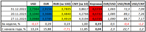 Что касается ожидания рынков по поводу решения по ставке ФРС, которое будет принято на следующем заседании 13 декабря, то 95,3% указывает на то, что ставка останется на нынешнем уровне (неделей ранее – 99,7%). Оставшиеся 4,7% приходятся на вероятность роста ставки на 0,25 пп до 5,75%. Первое снижение ставки ФРС рынок ждет в июне следующего года, а всего в 2024 году ожидается 3 снижения ставки до 4,75%. Неделю назад ближайшее снижение ставки ФРС рынок ожидал уже в мае следующего года, а всего в 2024 году ожидалось 4 снижения ставки до 4,50%.