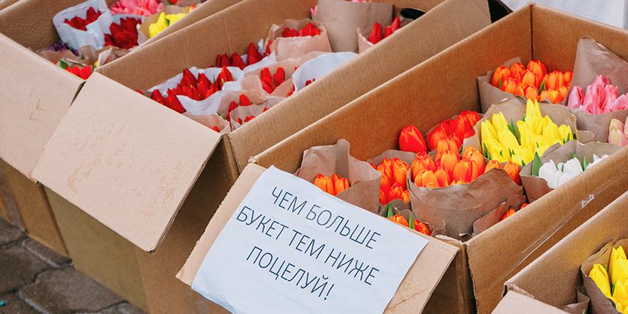 У нас с друзьями небольшой сезонный бизнес, мы продаем цветы уже 3 года. В прошлом продали 6 000 тюльпанов и решили расшириться. Теперь у нас несколько точек по Минску и план в этом году продать 14 000 цветов. За аренду точки на 5 дней мы платим 150 рублей.