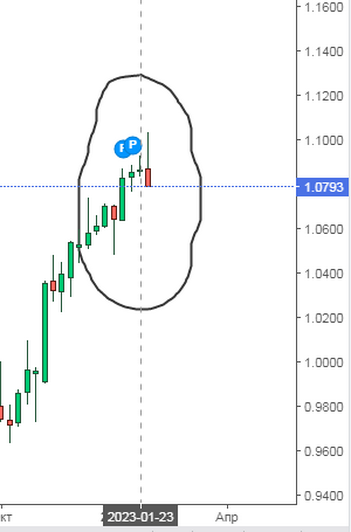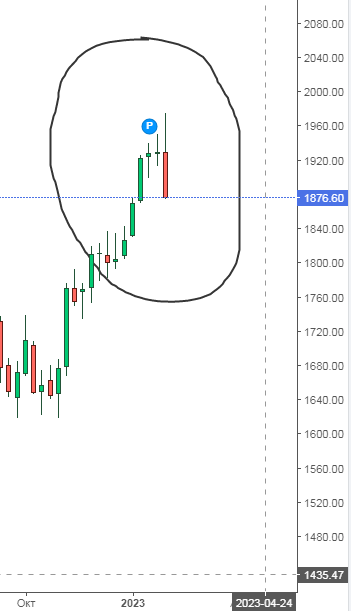 Казалось бы, вот она, заветная цель, и остается только закрепиться на этих рубежах. Но рынок рассудил по-своему, и в четверг-пятницу основные активы вернулись к среднемесячным ценам. Пара EUR/USD закрыла неделю на скромных EUR/USD 1,0793, золото также развернулось в цене, и к концу недели унция торговалась по 1876,60 USD/Oz. Более того, на недельных графиках двух активов сформировалась мощная техническая фигура под названием медвежий разворот.
