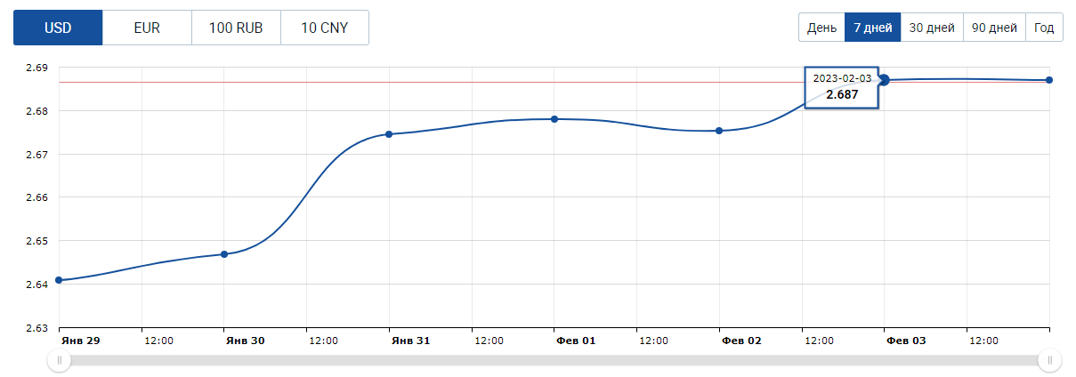 Доллар за прошлую неделю вырос в цене к белорусскому рублю на 1,75%, неделю закрыл на уровне USD/BYN 2,6870.