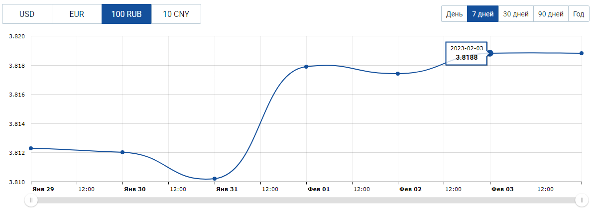 Российский рубль практически не изменился в цене, но также вырос на +0,17% к концу прошлой недели, до уровня в RUB/BYN 3,8188 за 100 российских рублей.