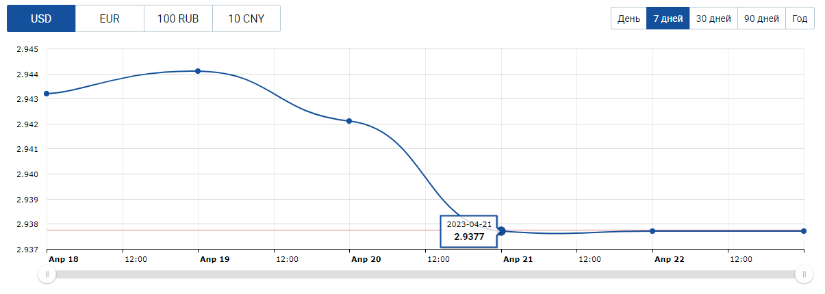 На белорусском валютном рынке короткая неделя и торги возобновятся только в среду 26 апреля. С учётом сказанного выше, курс доллара и евро могут минимально снизиться до USD/BYN 2,9000 и EUR/BYN 3,2000 соответственно. Курс российского рубля имеет шанс на небольшой рост до RUB/BYN 3,6200 за 100 российских рублей.