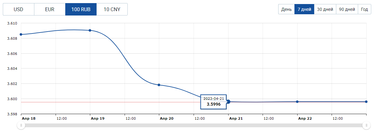 Курс российского рубля в составе валютной корзины также укрепился (за прошлую неделю на -0,86%) и на последних торгах зафиксировался на RUB/BYN 3,5996 за 100 российских рублей.