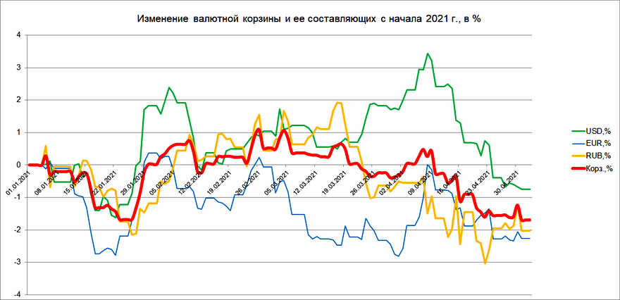 Вслед за долларом и российским рублем вниз пошла стоимость валютной корзины. Она подешевела на 0,14%, при этом обновив к концу недели минимум с начала года. Это четвертая неделя подряд снижения стоимости валютной корзины.