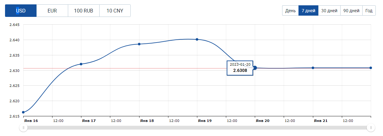 Доллар США на российских торгах остался на прошлой неделе около USD/RUB 68,83. На белорусском рынке пара USD/BYN в моменте поднималась до 2,6401, но на прошлые выходные «бакс» ушел с курсом 2,6308. За неделю доллар США подорожал на 0,97%, но к началу года сохраняет просадку на -3,86%. Объем торгов в течение прошлой недели находился ниже среднего уровня в диапазоне от 5,934 млн долларов в четверг, 19 января, до 15,037 млн долларов в пятницу, 20 января.