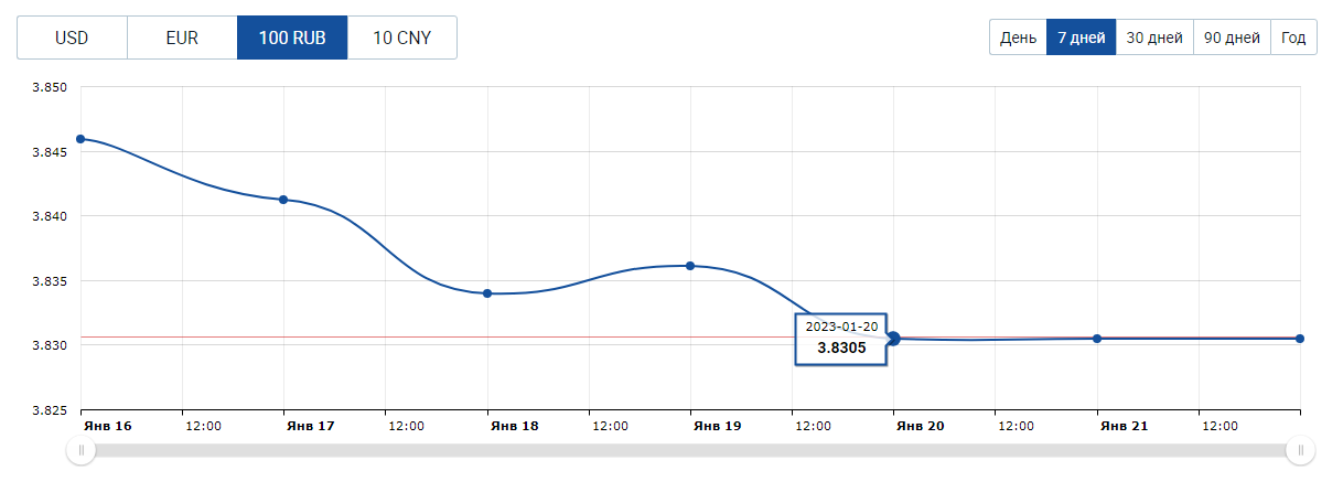 Российский рубль торговался активно. За прошлую неделю курс снизился на -0,86% и к закрытию торгов составил RUB/BYN 3,8305 за 100 российских рублей. Объем торгов в среднем составил немного более 30 млн долларов США в эквиваленте за торговую сессию.