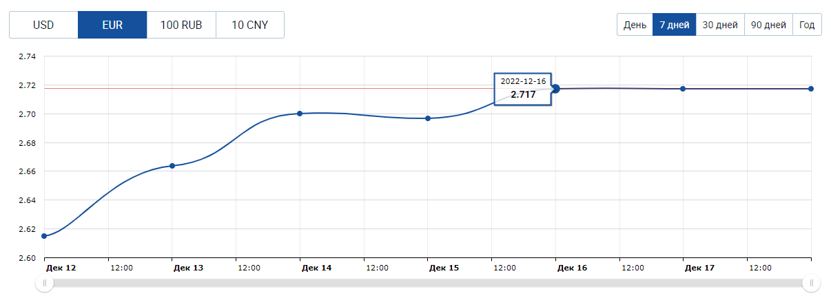 Евро за прошлую неделю также укрепил позиции. С учетом роста на внебиржевом рынке Форекс евро вырос на еще более внушительные +4,81 %, до EUR/BYN 2,7170. В течение прошлой пятницы курс поднимался в максимуме до EUR/BYN 2,7200. Отставание с начала года сократилось до -5,74 %.