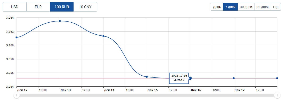 Курс российского рубля на фоне роста доллара США и евро остался практически без изменений с легким минусом на -0,17 %. С начала года рубль остается в плюсе на +15,24 %, и курс закрытия прошлой недели составил RUB/BYN 3,9552 за 100 российских рублей, а объем торгов российским рублем на БВФБ составил в долларовом эквиваленте за прошлую неделю немногим более 214 млн долларов США.