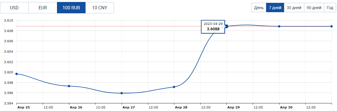 На российском валютном рынке курс доллара США в пятницу, 28 апреля, снижался до USD/RUB 79,173, что и спроецировалось по итогу на белорусских валютных торгах. Причиной укрепления российской валюты стало улучшение качества российского бюджета и итоги последнего заседания монетарного комитета Центробанка России в прошлую пятницу.