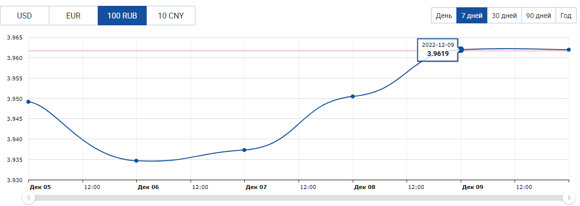 Курс российского рубля на торгах БВФБ за неделю минимально снизился на -0,04 %, до RUB/BYN 3,9616 за 100 российских рублей. К началу года сохраняется рост курса российской валюты на +15,43 %.