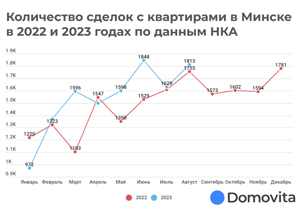 В 2022 году количество сделок с квартирами в Минске и в Беларуси достигло рекордных значений. Всего по стране купили 55 605, а в Минске – 17 985 квартир. За 8 месяцев 2023 года белорусы провели уже больше 36 тысяч сделок по стране и 12,3 тысячи сделок в столице.
