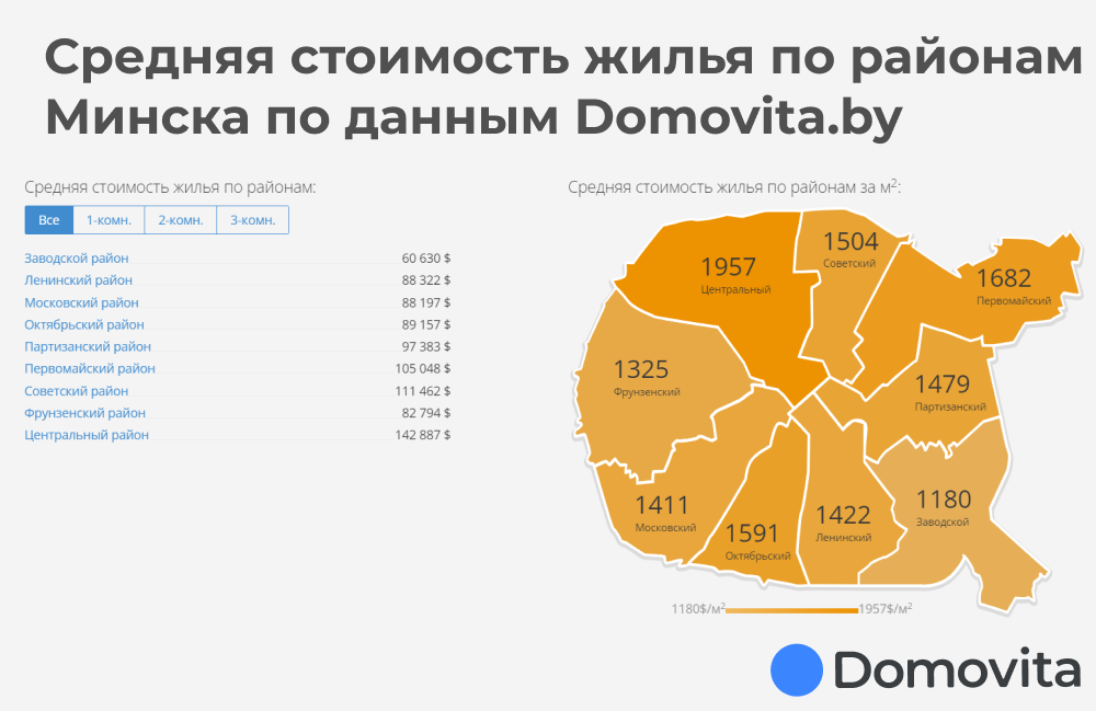 С сентября 2022 по сентябрь 2023 цена квадратного метра в Минске выросла на $155: с $1397 до $1562. Активнее всего цена росла с ноября 2022 по февраль 2023, когда квадрат прибавил $91. Это был предновогодний период, когда недвижимость хотят успеть продать и купить перед праздником.