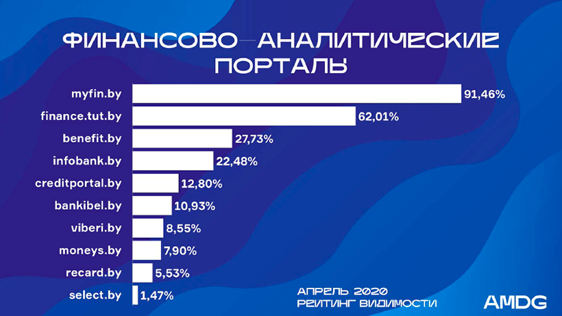 Площадки Myfin.by, Finance***by, Benefit.by продолжают наращивать видимость. Сайт Bankibel.by поднялся на две строчки вверх, увеличив видимость в два раза ― до 10,93%, и разместился на шестом месте. Финансовый портал Infobank.by с февраля по апрель потерял 2,48%, рейтинг составил 22,48%. На три позиции спустился проект Recard.by: сайт занял девятое место с рейтингом 5,53%.
