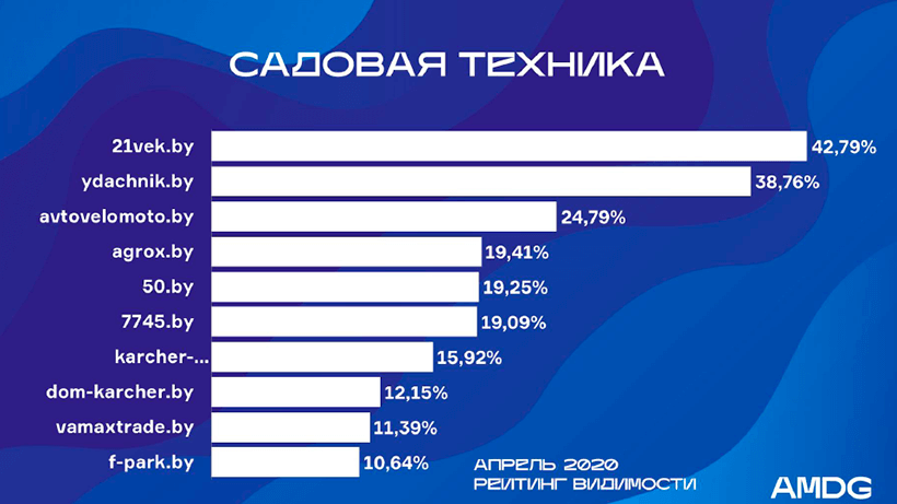 У большинства представителей категории «Садовая техника» в апреле зафиксирован рост видимости. Так, показатель увеличился у 21vek.by (↑на 0,58%), Ydachnik.by (↑на 4,02%), 7745.by (↑на 0,11%), Karcher-stuttgart.by (↑на 0,85%), Vamaxtrade.by (↑ на 4,54%) и F-park.by (на ↑5,37%).