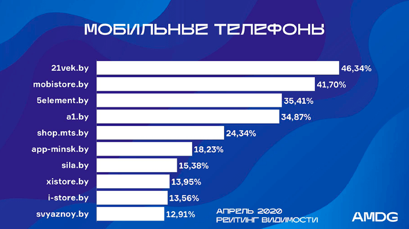 Самый высокий рост видимости демонстрирует сайт телеком-оператора А1.by. В апреле показатель вырос на 3,95% и остановился на 17,80%. Другой оператор связи, компания МТС, переместилась с седьмого на пятое место рейтинга. Видимость сайта составила 12,45%. Онлайн-гипермаркет 21vek.by, 5element.by и Sila.by увеличили свою видимость от 0,35% до 2,44%.