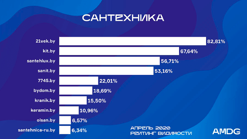 Мебельный интернет-магазин Meko.by вернулся в тройку видимых сайтов в этой категории и занял второе место. На третьей строчке Nm-shop.by, а на четвертой ― Mebelblizko.by, который потерял в апреле 4,23% видимости. Зато Ami.by стабильно на пятом месте с постепенно увеличивающимся показателем.