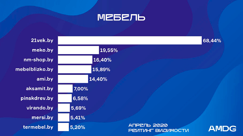 Очень высоко взобрался сайт гипермаркета 21vek.by: процент видимости мебельного направления магазина составляет 68,44%. Все остальные представители рейтинга видны в поисковых системах до 20%.