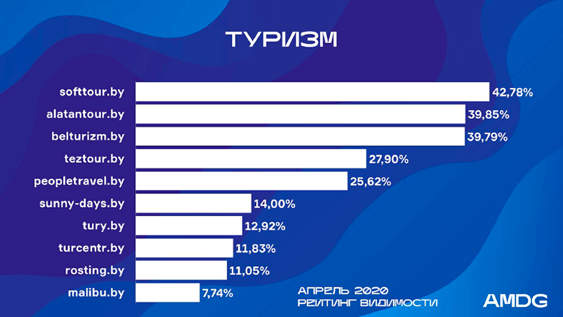 С февраля по апрель туристическая компания «Ростинг» (Rosting.by) потеряла 12,39% видимости и переместилась с пятого на девятое место (11,05%). Еще один лидер рейтинга ― Peopletravel.by ― спустился со второй на пятую строчку (25,62%). Alatantour.by, наоборот, нарастил видимость на 11,36%, показатель составил 39,85%.
