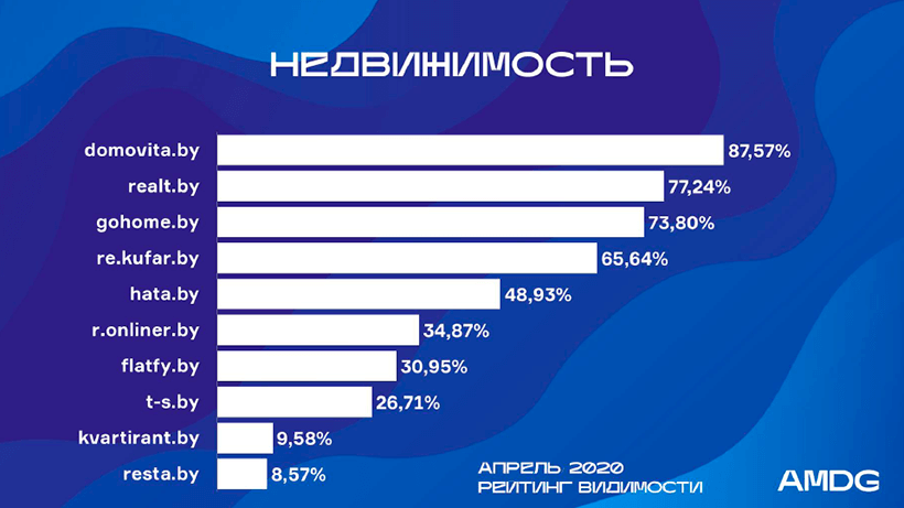 Видимость сайтов недвижимости растет. Самый высокий прирост в категории у сайта Domovita.by ― 4,31%. Общий показатель составил 87,57%. На втором месте агентство недвижимости “Твоя Столица” (T-s.by): видимость выросла на 2,66% и остановилась на 26,71%. Третью строчку в апреле занял Realt.by ― 2,54%, показатель 77,24%.