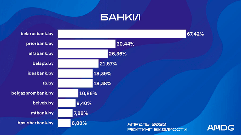 Belarusbank.by (Беларусбанк) потерял 3,82%, но по-прежнему занимает первое место в банковском направлении: рейтинг сайта остановился на 67,42%. Видимость Priorbank.by (Приорбанка) упала на 4%, рейтинг составил 30,44%.