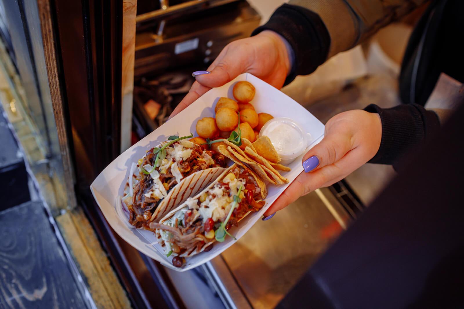 На ярмарке можно попробовать сочные тако-сеты от Comida Mexicana с цыпленком либо говядиной. Томленое мясо завернуто в хрустящую кукурузную лепешку с картофельными шариками, начос и сметанно-чесночным соусом.