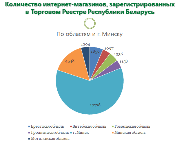 Наибольшее количество интернет-магазинов зарегистрировано в Минске и Минской области – 17728 и 4548 соответственно. Наименьшее число отмечено в Витебской области – 1097.
