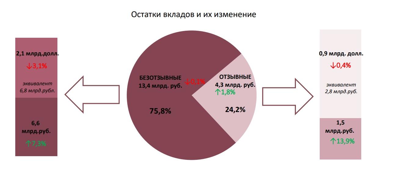 В основной своей массе средства вкладчики хранят на безотзывных депозитах: на их долю приходится 75,8% от общего объема (13,4 млрд рублей), а на отзывные – лишь 24,2% (4,3 млрд рублей).