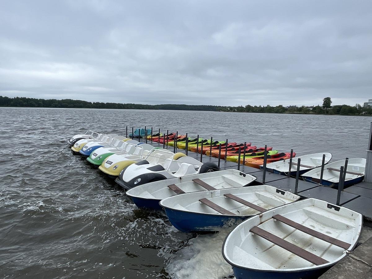Припаркованы у причала и катамараны. Они покрашены и подготовлены к сезону, но, пока у рыбы нерест, прокатиться на них нельзя.