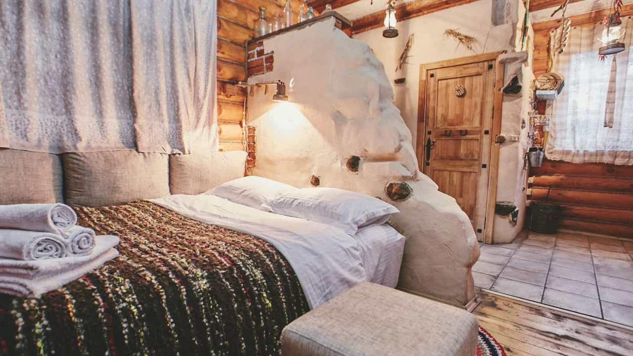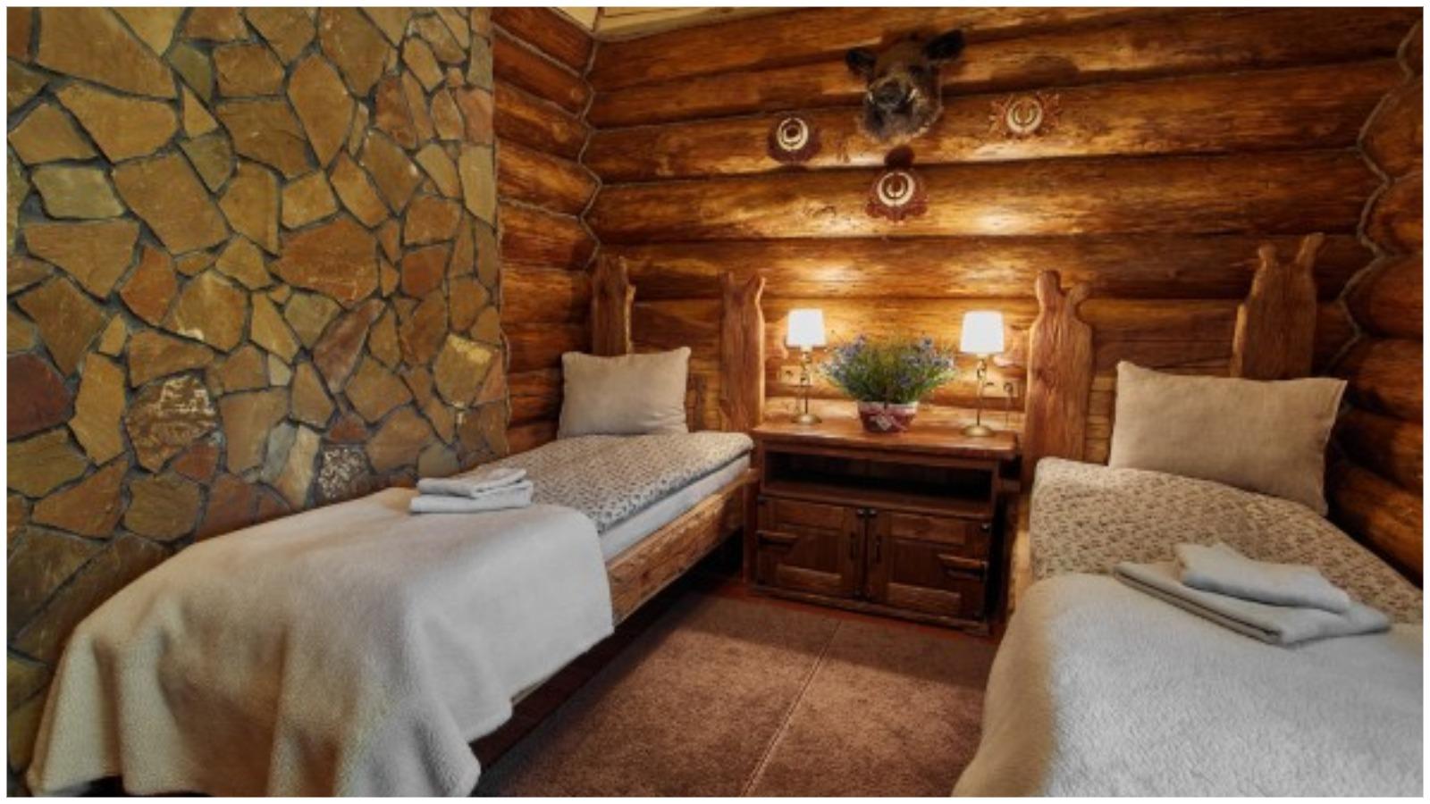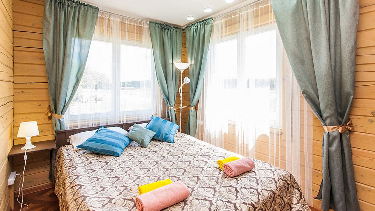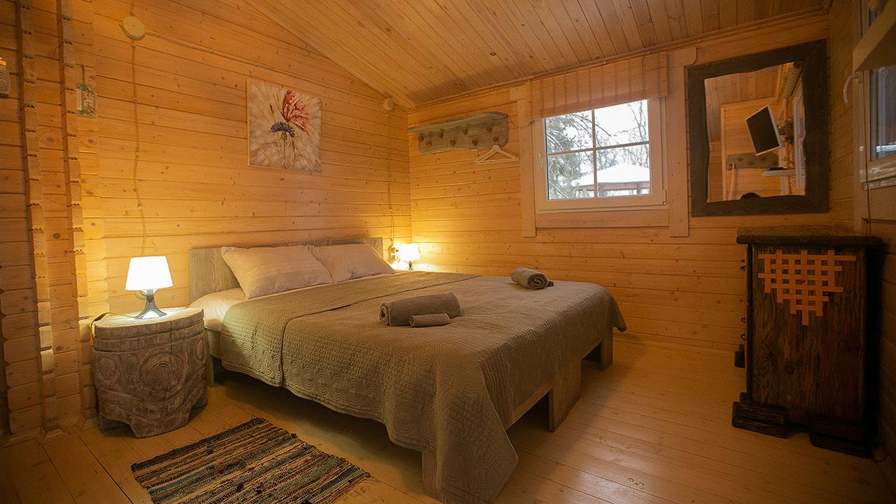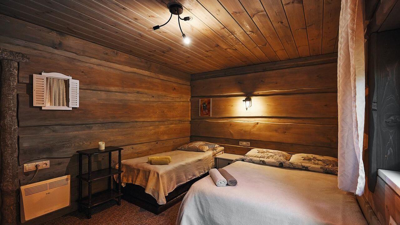 Проживание в экоотеле организовано не по домикам, а по номерам. На компанию из 6-8 человек предлагают бронировать отдельные номера спального типа с кроватями и санузлом, без кухни. Стоимость стандарта на двоих – 190 рублей в сутки, полулюкса – 250 рублей/сутки (до 3 человек), люкса – 310 рублей/сутки (до 4 человек). Во всех вариантах завтрак включен в стоимость. В составе комплекса есть баня вместимостью 6 человек. Стоимость двухчасового посещения – 60 рублей.