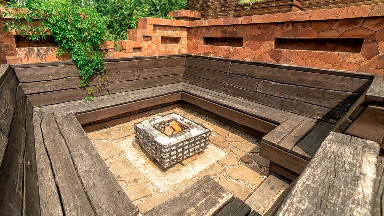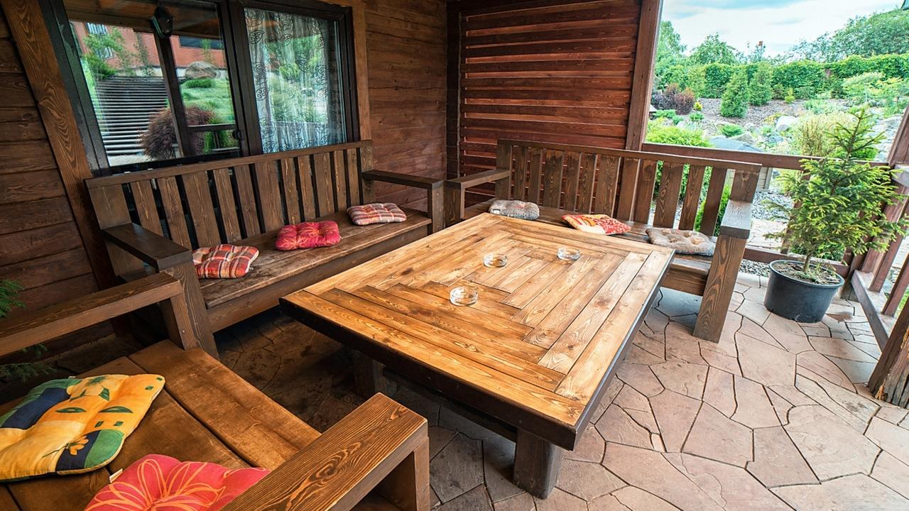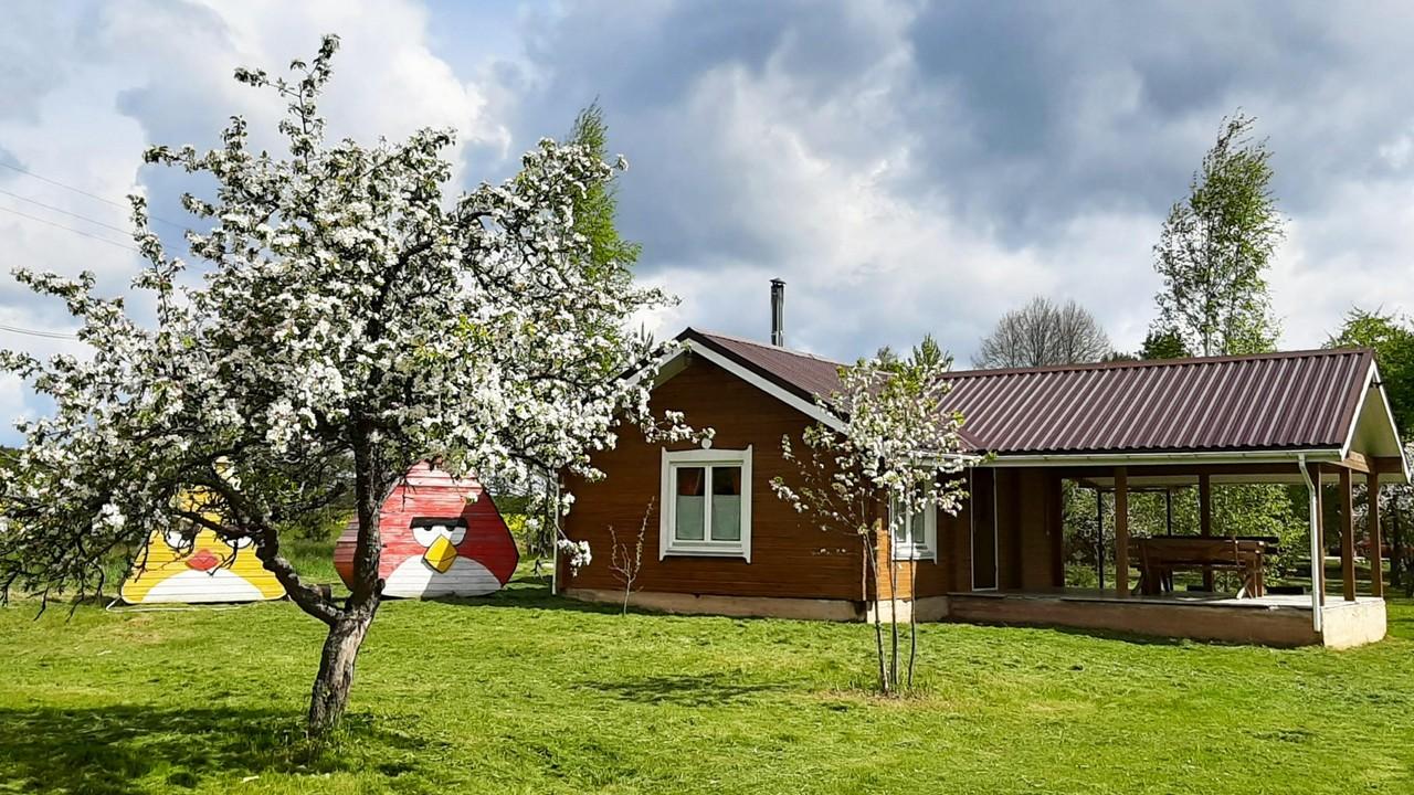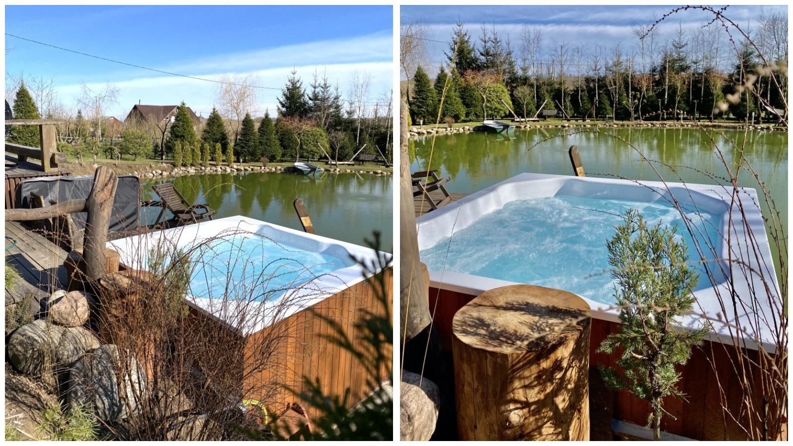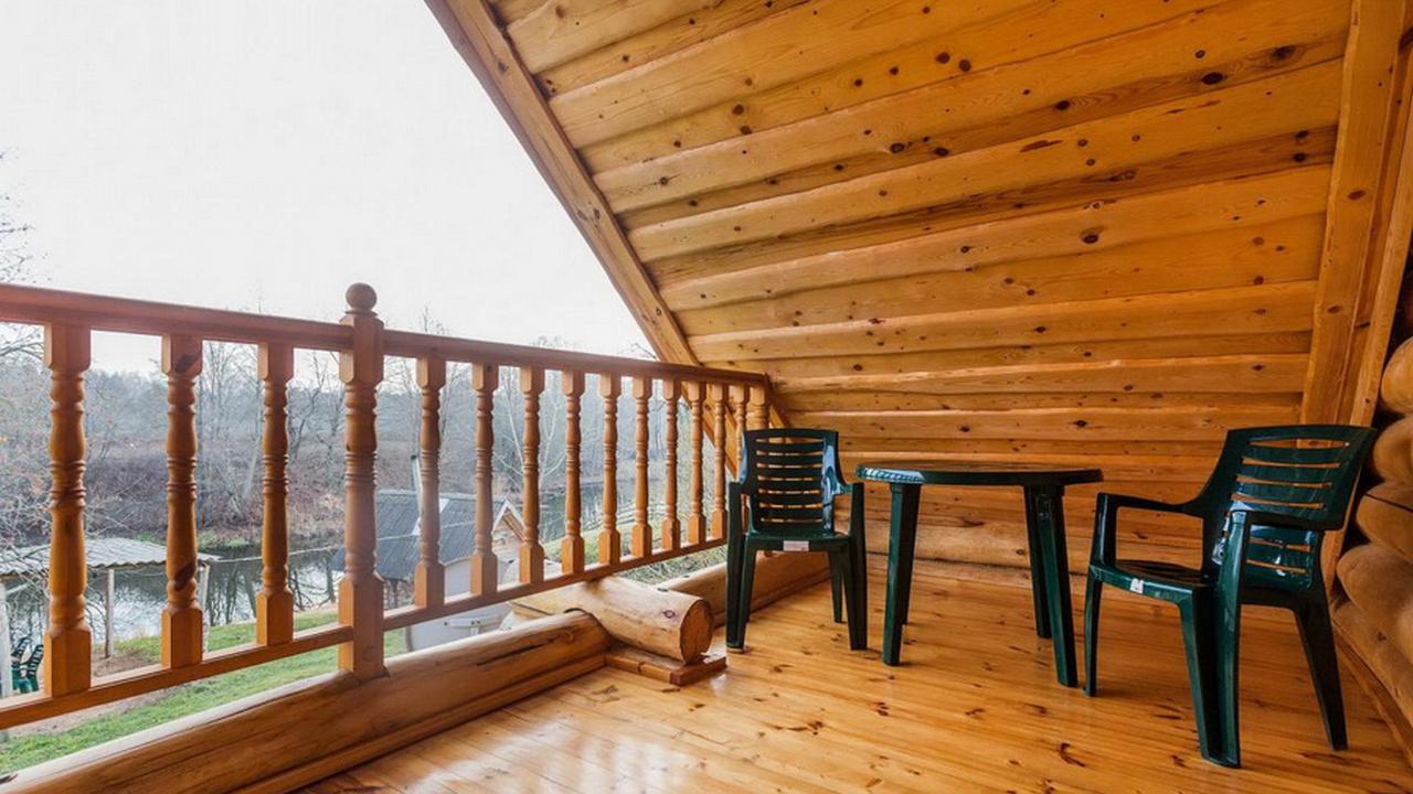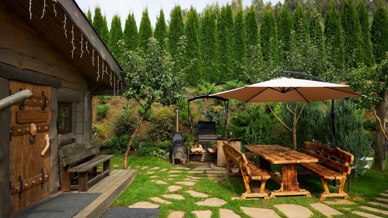 Комплекс включает несколько домов разной вместимости. Для компании в 6-8 человек подходит домик №3 у пруда, с двумя спальнями, баней и джакузи. У домика есть свой мини-дворик с садовой мебелью и зоной барбекю.