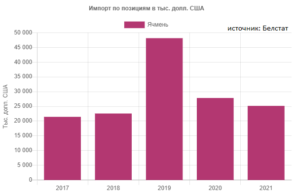 Наибольший объем закупок ячменя за пятилетку (2017–2021 гг.) Беларусь совершила в 2019 году – 225,7 тыс. тонн на сумму $48,1 млн. В остальные годы стоимостный объем импорта был примерно на одном уровне.