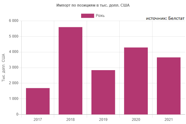 В разрезе анализируемой пятилетки максимальные объемы импорта наблюдались в 2018 году – 32944 тонны ($5,6 млн). В основном Беларусь закупает за границей семенную рожь.