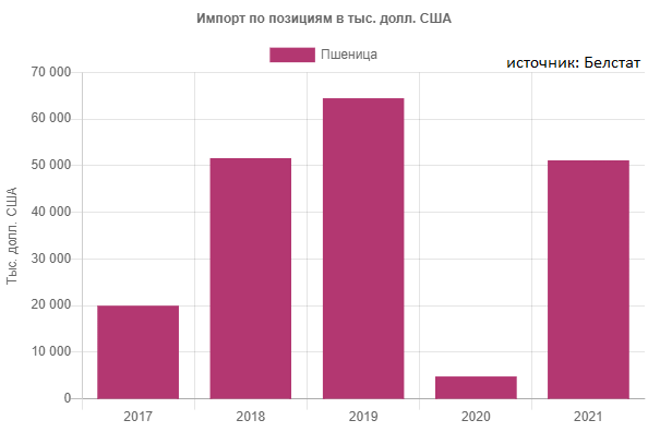 В 2021 году Беларусь импортировала 193,3 тыс. тонн пшеницы, заплатив за ввоз $51,1 млн. Основным поставщиков зерна на белорусский рынок выступила Российская Федерация (стоимость импорта для РБ – $48,5 млн).