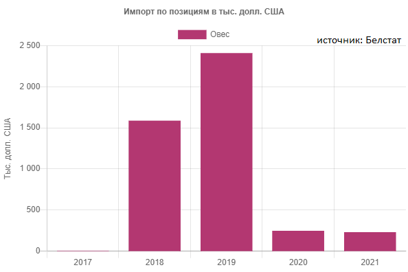 В 2021 году импорт составил 570 тонн, а в деньгах – $229,6 тыс. Главным образом закупался семенной овес, основным поставщиком которого выступила Польша (стоимость импорта для РБ – $216,7 тыс.).